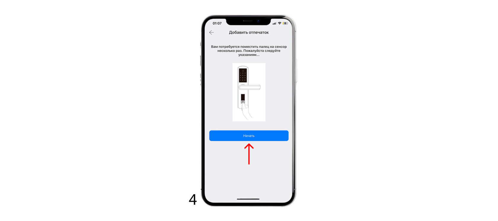 4. После нажмите кнопку «начать» и прислоняйте палец к сенсору замка соболюдая указания в приложении.