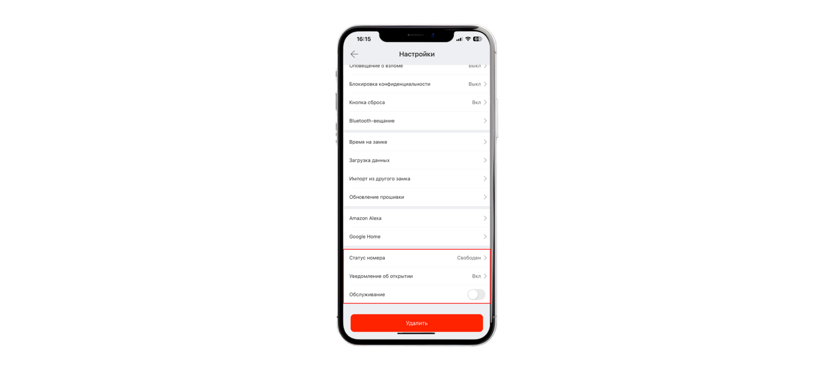«Статус номера» - можно менять на «свободен» или «занят». «Уведомление об открытии» - после включения функции при открытии двери администратор получит уведомление ( функци работает только с WiFi шлюзом ). «Обслуживение» - ?????????
