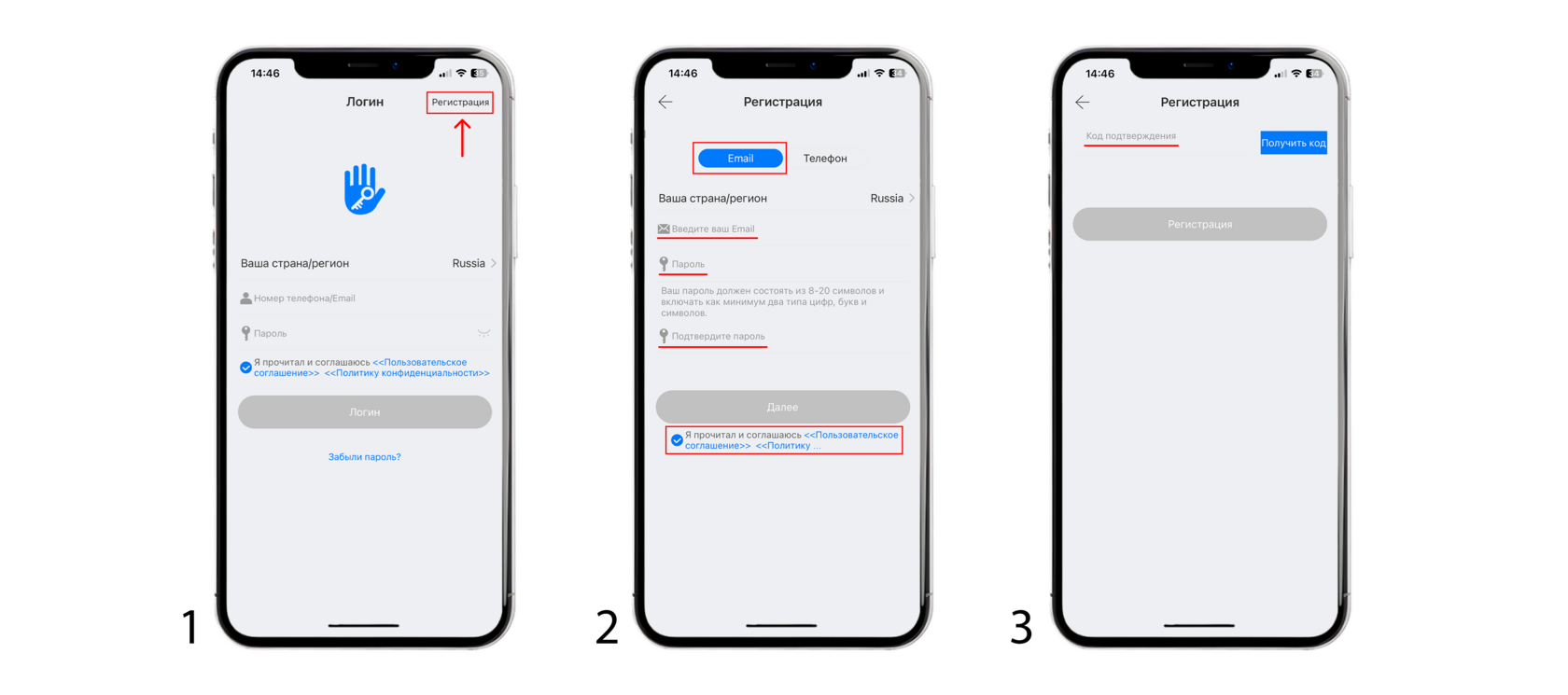 Выбераем регистрацию через Email или номер телефона, после вводим данные, пароль и подтверждение пароля.
