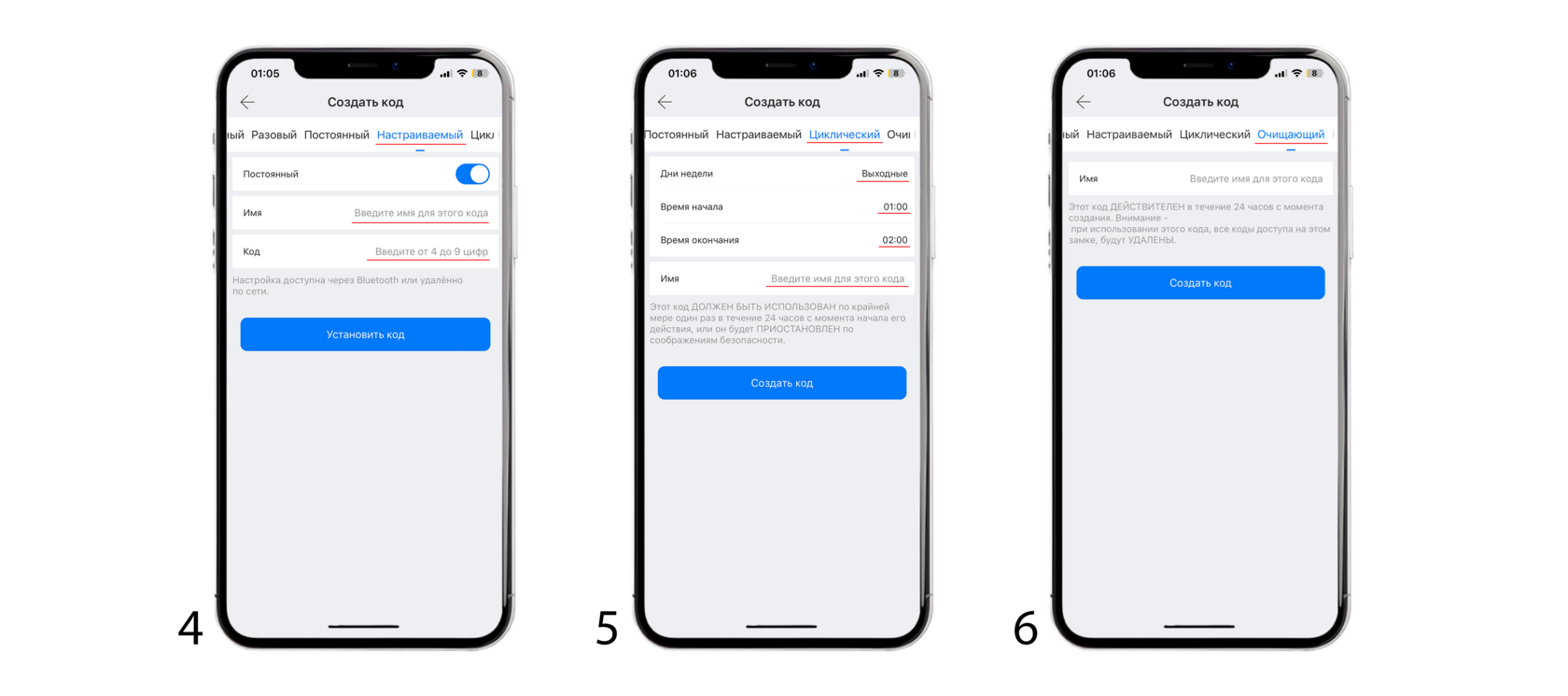 4. Настраиваемый - можно выбрать временное действие или постоянное, код настраиваете самостоятельно ( работает только вблизи замка или удаленно при наличии шлюза ) 5. Циклический - я хз как это объяснить !!! 6. Очищающий - при использовании этого кода в течении 24 часов с момента создания, все коды доступа на этом ззамке будут удалены.