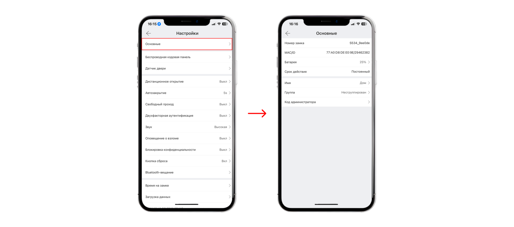 Во вкладке «Основные» показывает: индивидуальный номер замка, MAC/ID, заряд батареи, срок действия. Также тут можно изменить имя, группу и код администратора ( если вы являетесь владельцем замка ).