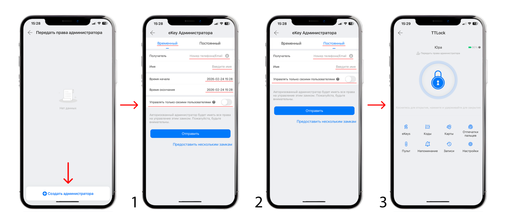 Для передачи прав введите номер или почту зарегистрившегося, после у него появится замок на главной странице.