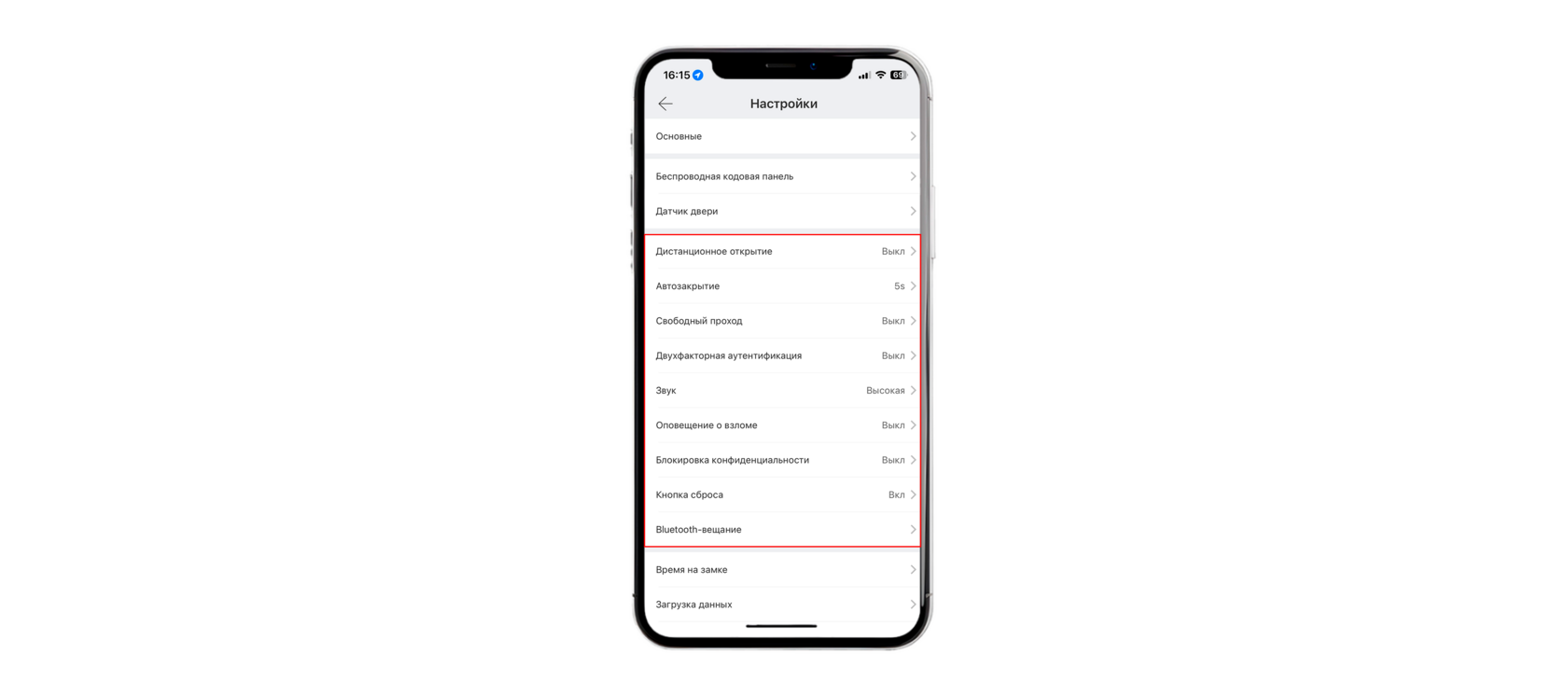 «Дистанционное открытие» - позволяет открывать замок удаленно через WiFi шлюз. Эту функцию можно включить или выключить только через Bluetooth, находясь рядос с замком. «Автозакрытие» - замкок автоматически закрываетс после окончания заданного вами времени. «Свободный проход» - вы можете установить несколько временных периодов для режима прохода. В течении заданных периодов замок остается в открытом состоянии после разблокировки. «Двухфакторная аунтентификация» - для открытия двери необходимы два разрешения на доступ. «Звук» - настройки уровня громкости звуковых оповещений. Можно полность выключит звуковые оповещения. «Оповещение о взоломе» - включив, вы активируете систему оповещения о взломе. «Блокировка конфиденциальности» - после активации только администратор сможет открыть дверь. «Кнопка сброса» - включив, вы сможете сбросить настройки, удерживая кнопку сброса. Выключив, кнопка сброса не будет работать. «Bluetooth-вещание» - обновление вещания Bluetooth.
