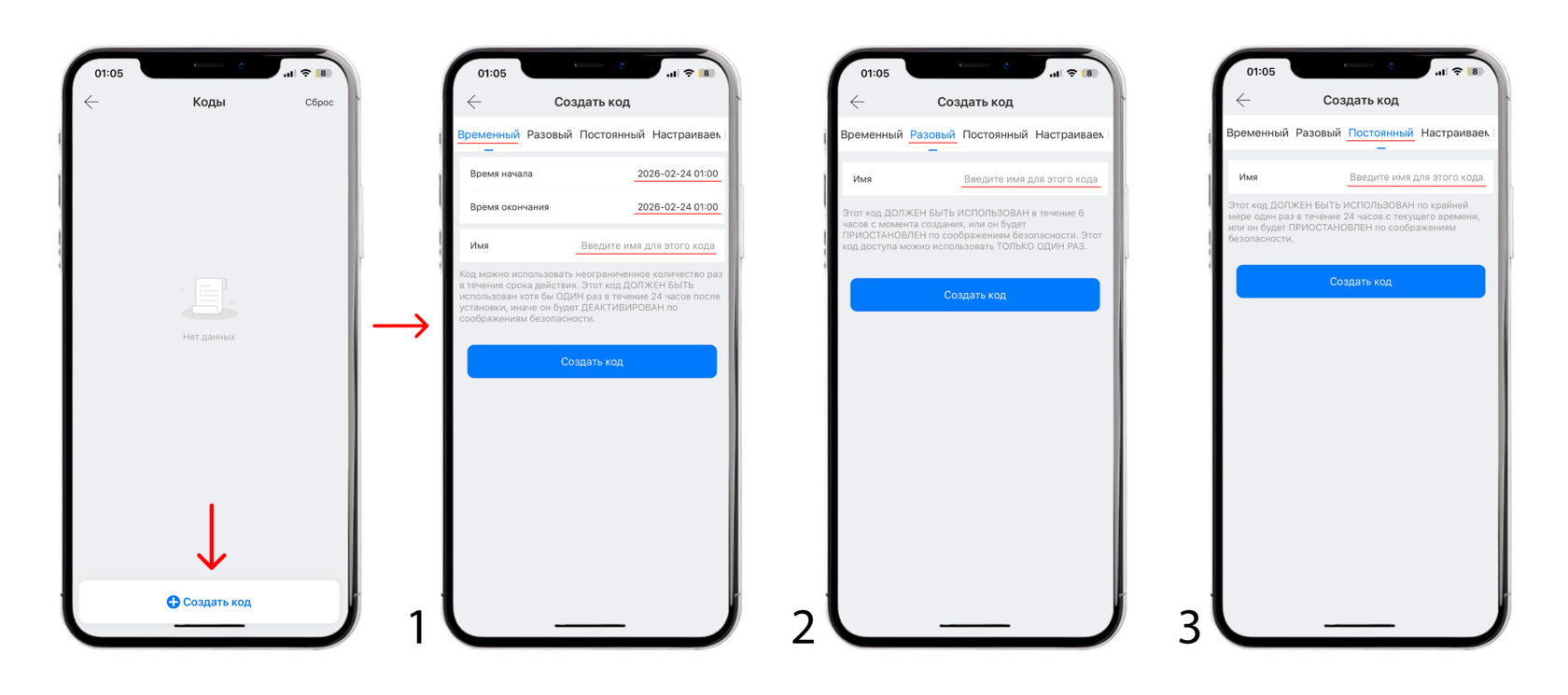 Временный - действует выбранное время, код генерируется самостоятельно ( работает удаленно без шлюза ).