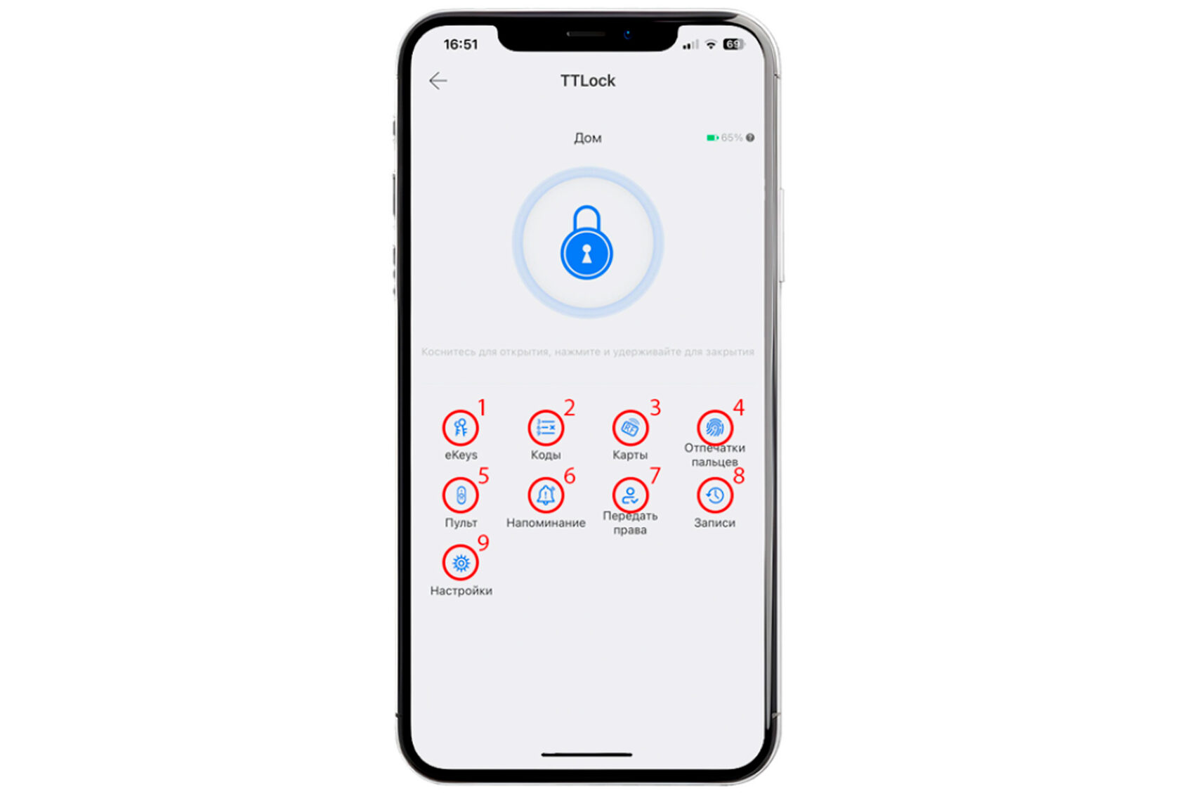 4. Дайте имя вашему замку 5. Разберем все кнопки управления на странице замка: 1) Передача ограниченных прав 2) Настройка кодов ( временные, разовые, постоянные, настраиваемые и тд.) 3) Добовление IC-карт 4) Добовление отпечатков пальца 5) Добовление пульта управления ( пульт приобретается отдельно ) 6) Напоминание о сценарии 7) Передача прав 8) Записи посещения 9) Настройки
