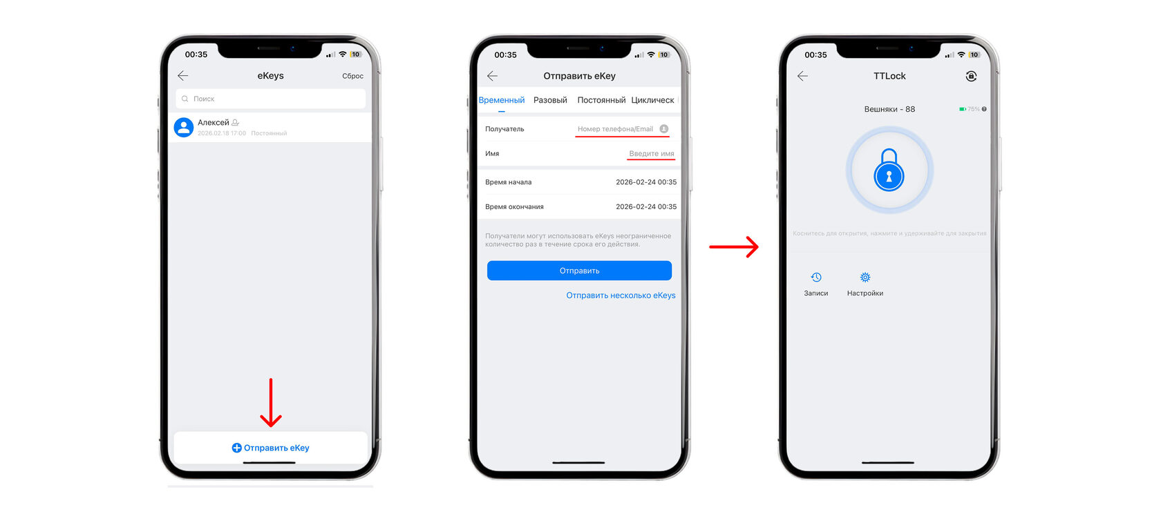 1. В главном меню нажмите на «+» справа сверху 2. Выберите все типы замков 3. Чтобы замок появился в приложении, коснитесь сенсорной панели внешней части. После выберите появишейся замок